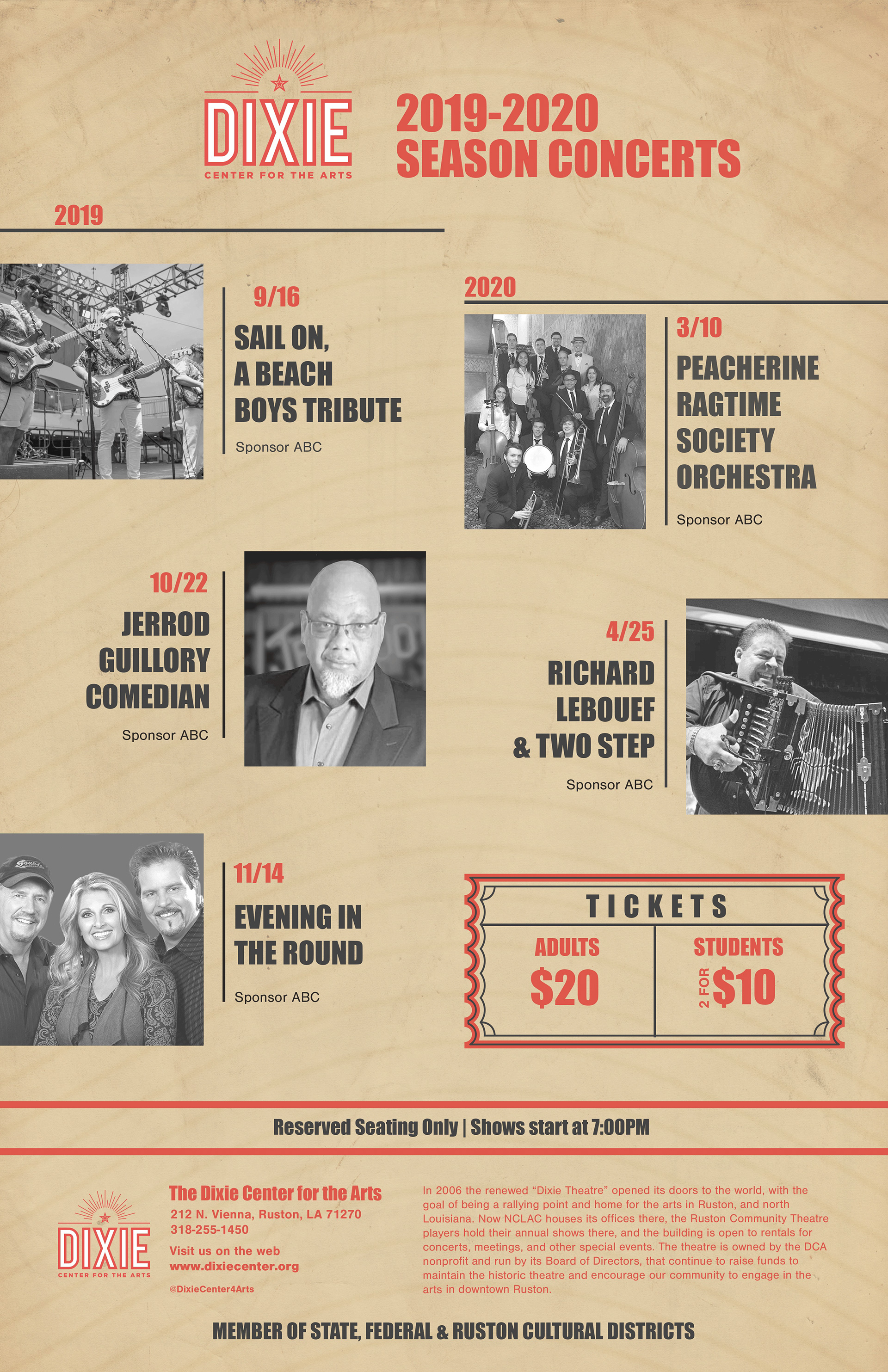 The first show of the 2019-2020 Dixie Season of "Nostalgic Momentum" was a highly energetic show that focused on performing songs by America's Band, The Beach Boys. Inspired by a beach postcard, the branding gives off a bright fun summer vibe that also highlights the members of the band. It mimics the retro imagery that the original Beach Boys posters displayed in the past.